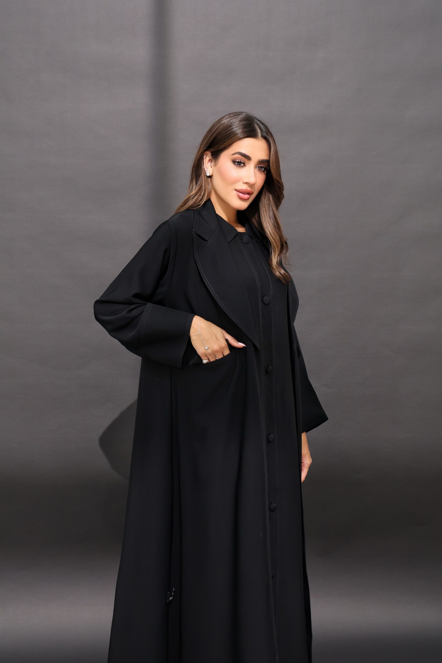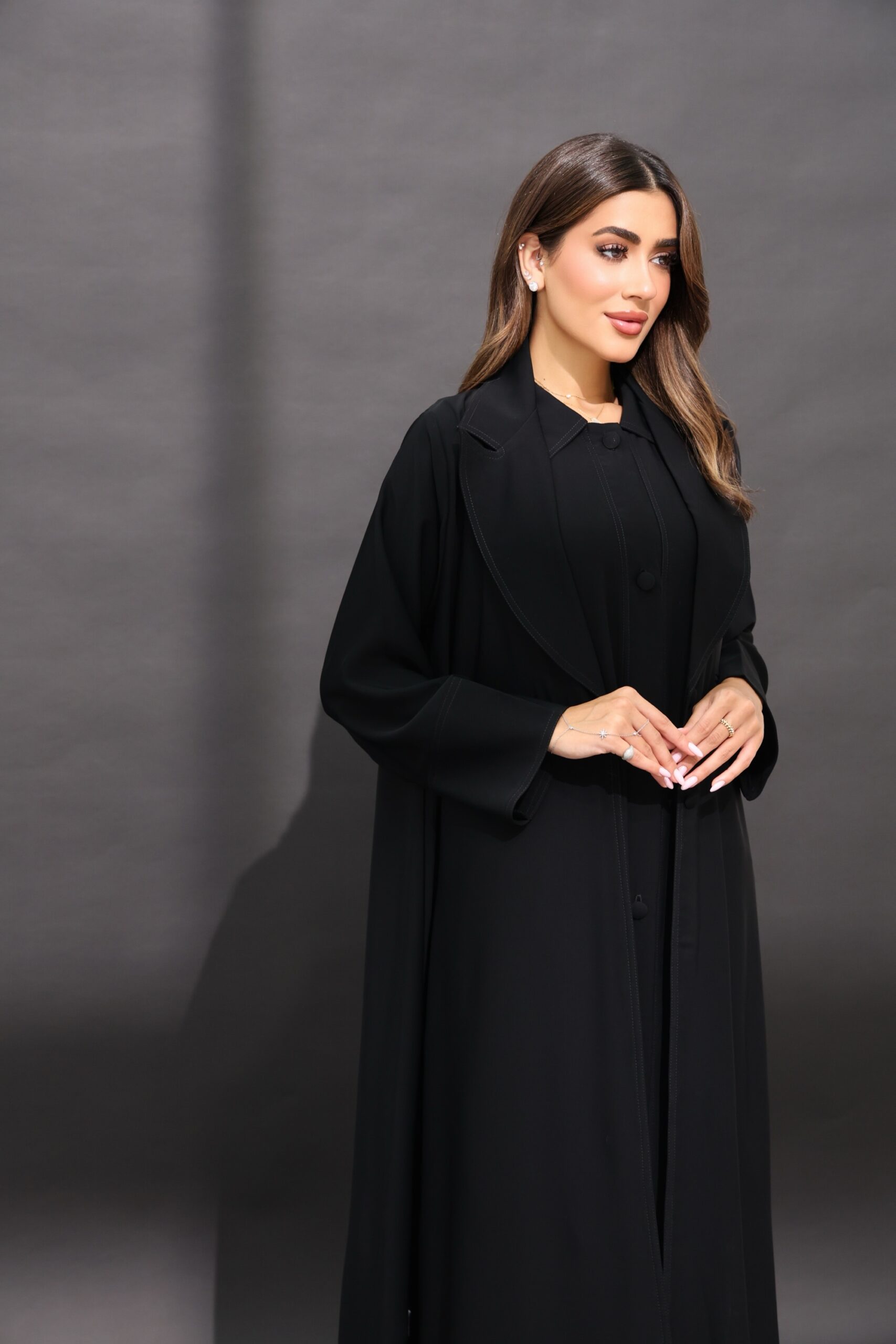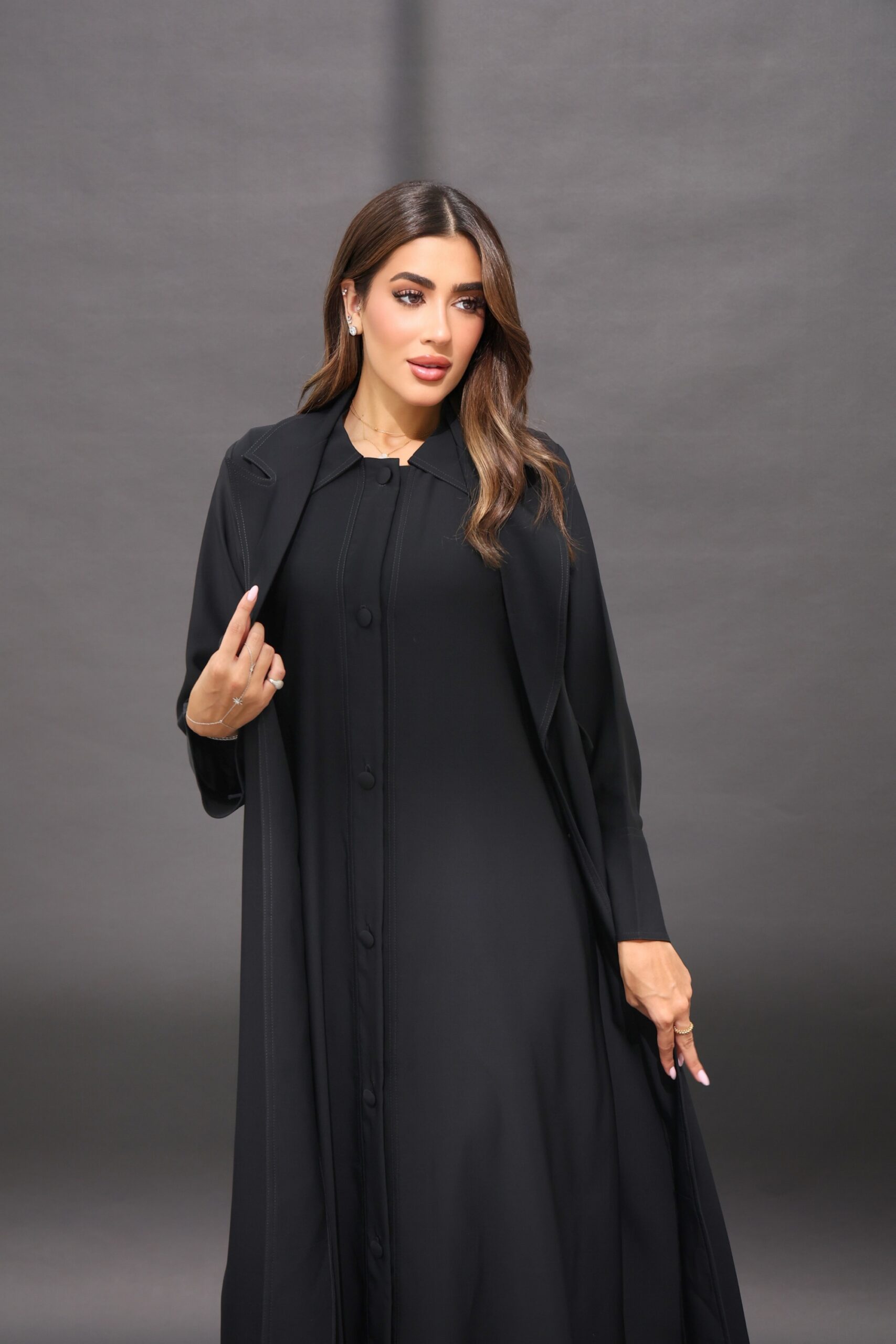 العباية قطعتين درس مشغول بإزرار من قدام وعباية خارجية القماش ندى الكوري